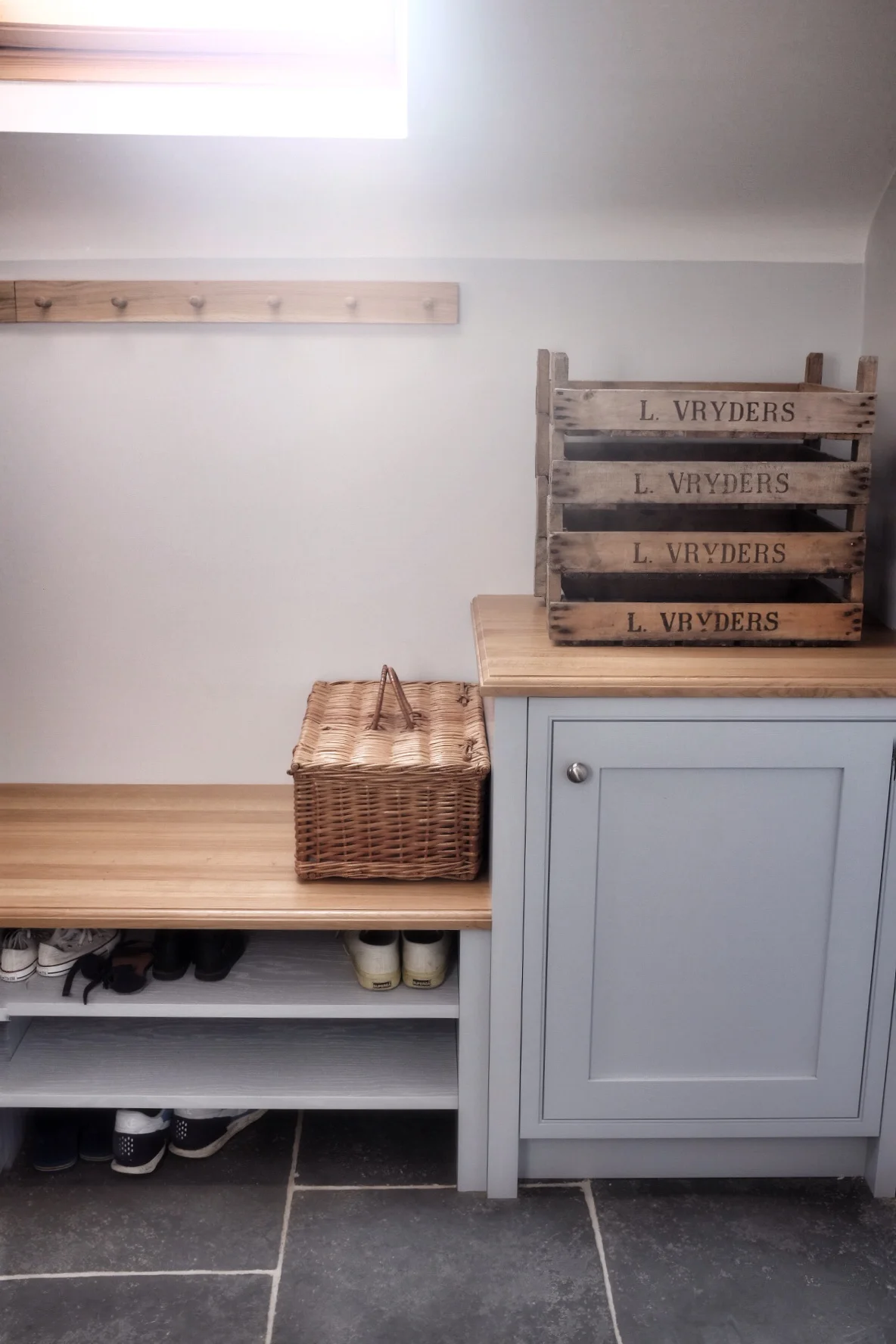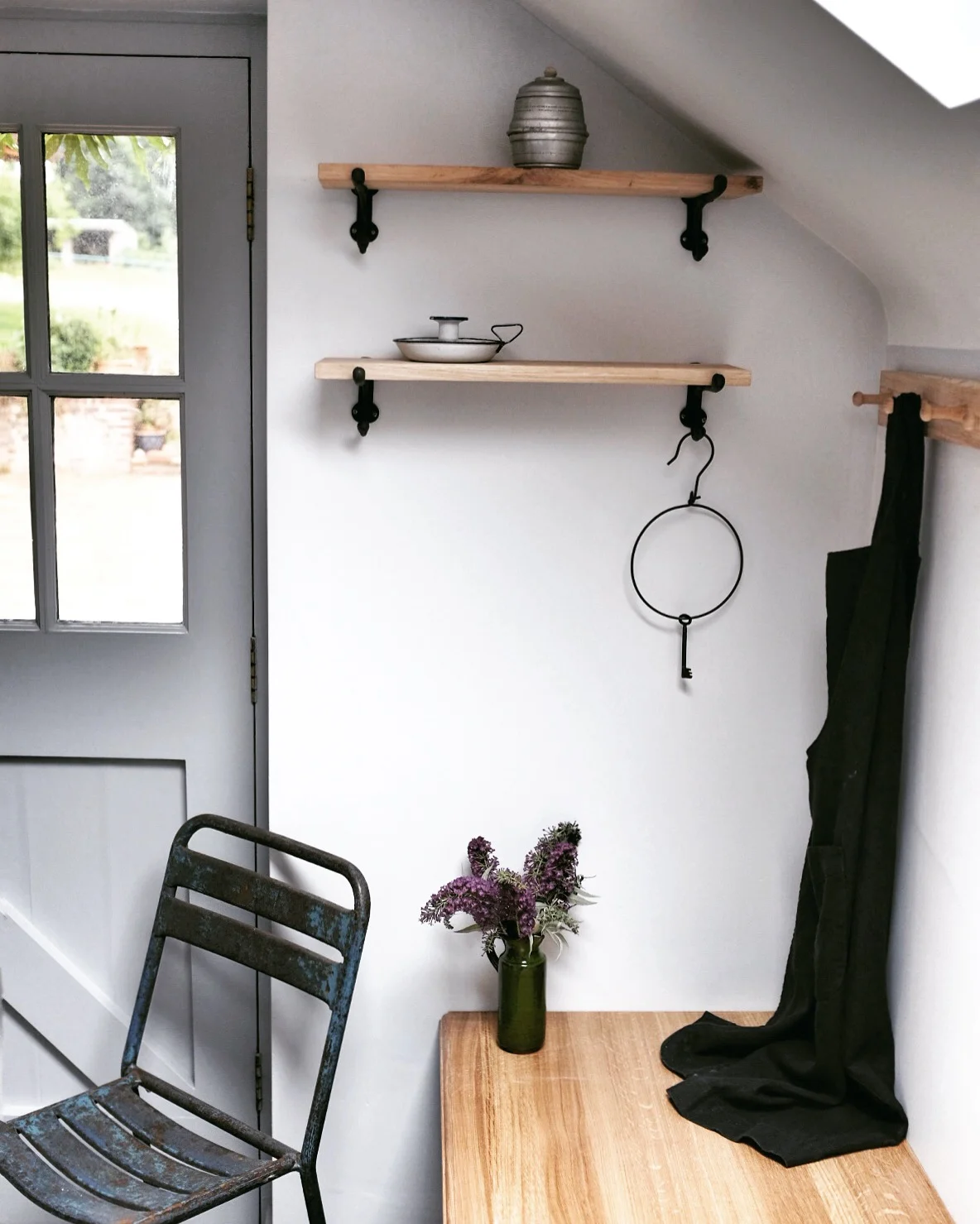 We reused our old kitchen sink and worktop, but we've had a lovely new oak bench and some raw oak shelves from Garden Trading fitted. We've had a booze fridge put in, which is a very heaven and should be included in the hierarchy of needs. The walls are Gauze and the woodwork Dark Gauze from Little Greene, which feels cool and restful. Right now it looks incredibly sparse and pared back, which won't last, but there's room for everything to have a proper place. Happy Darrens.