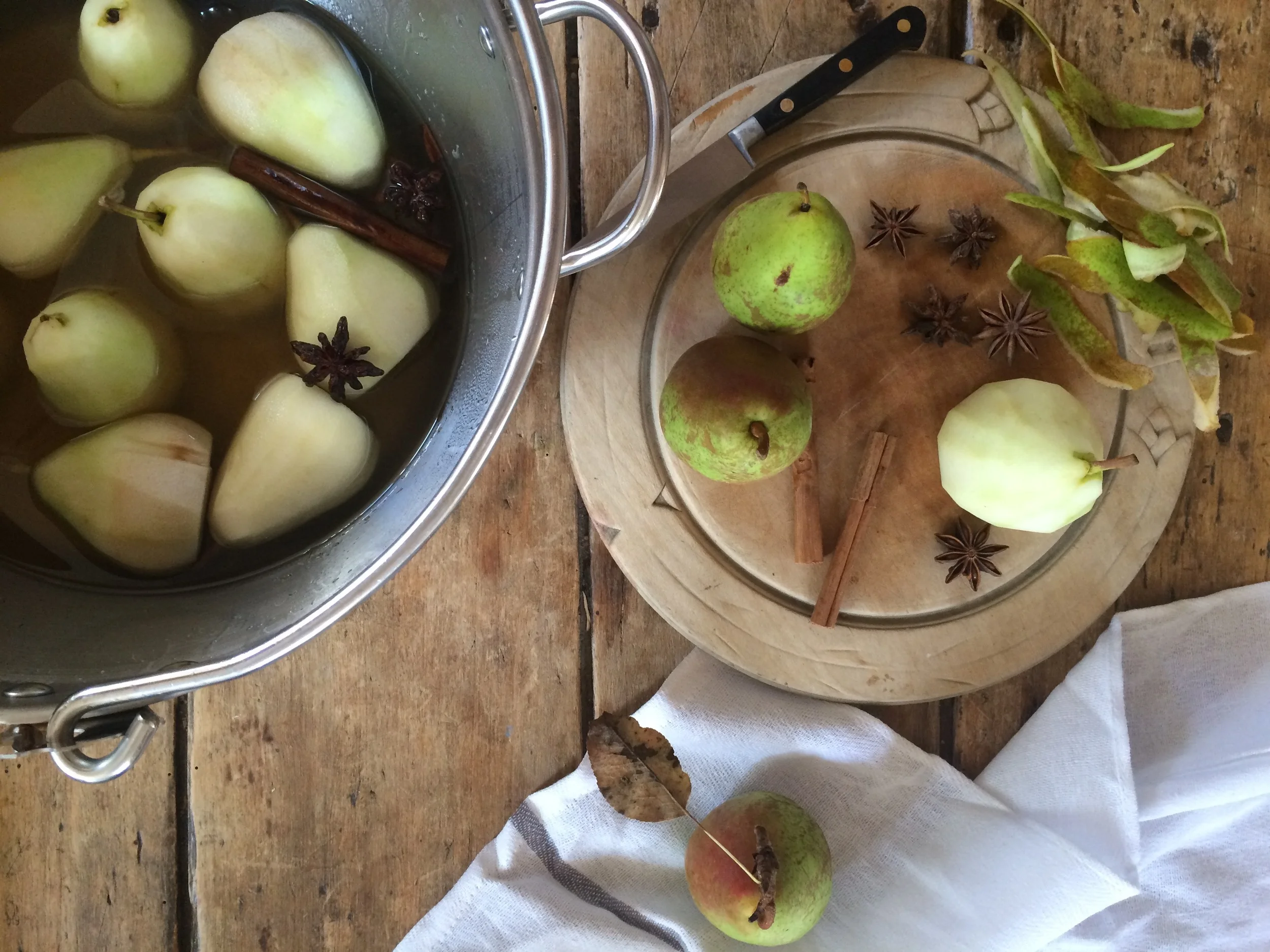 For the poached pears, simply combine a bottle of white wine with 400g of granulated sugar, star anise and cinnamon, heat until the sugar has dissolved and then put in the pears and poach for 30 mins, before bottling up in large sterilised jars.