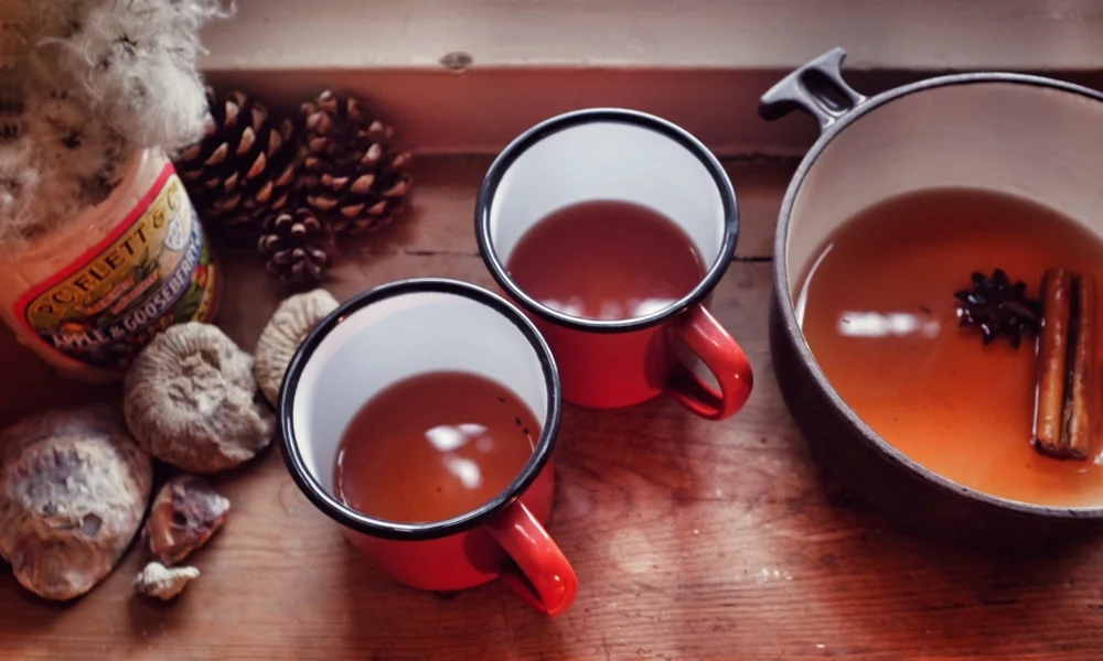 500ml of a good quality cider, 1 Tbsp dark muscovado sugar, 1 cinnamon stick, 1 star anise. Warm all the ingredients together in a heavy bottom saucepan until the sugar is all incorporated, making sure you don't boil away the alcohol. Pour into your favourite tin mug and add sliced apple.